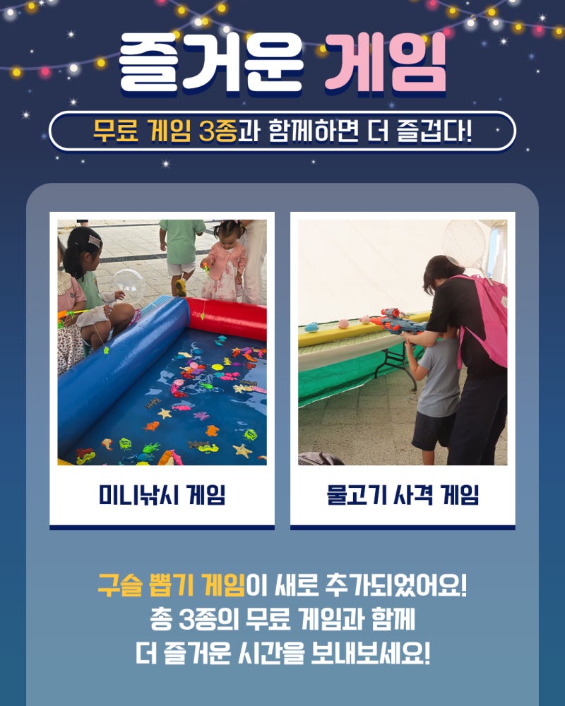 - 미니낚시, 물고기 사격, 구슬뽑기 등 남녀노소 참여 가능