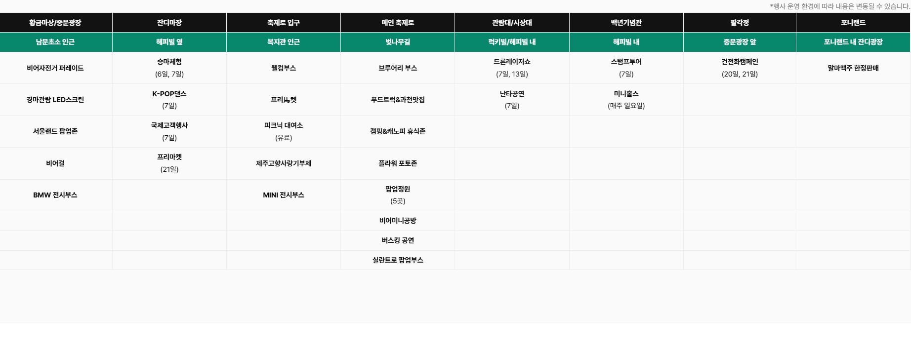 - 비어자전거: 매주 토·일 (15시~18시 매시간, 토요일만 20시 추가 회차)