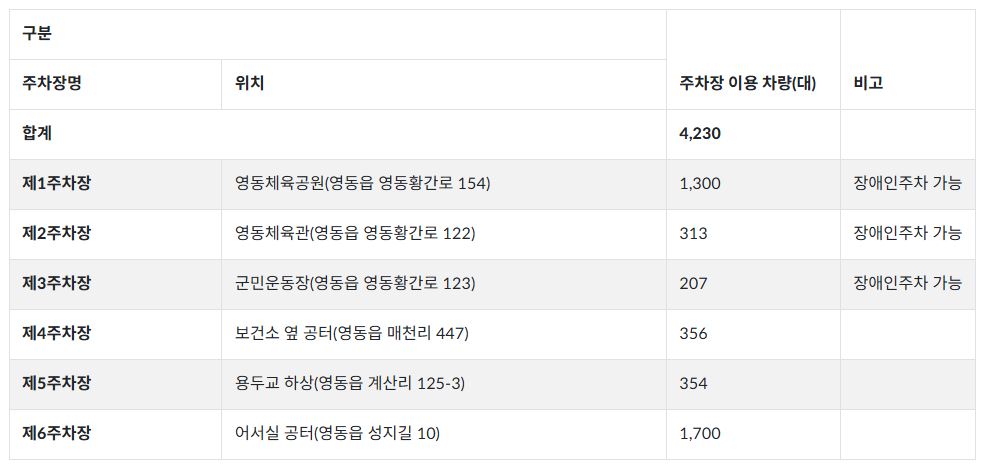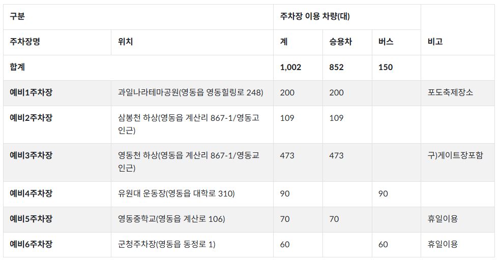 • 예비 주차장 : 총 1,002대 (포도축제장소·삼봉천 하상 등)