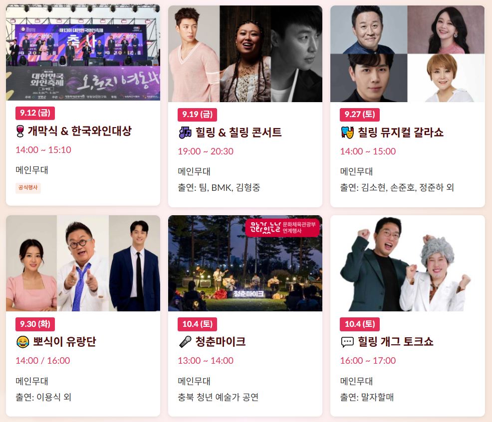 올해 대한민국와인축제는 와인과 음악, 먹거리, 휴식이 모두 어우러진 힐링 페스티벌입니다. 특히 팀, BMK, 김형중, 김소현, 손준호 등 가수 라인업이 화려하게 준비되어 있어 놓치면 아쉬울 공연들이 가득합니다.