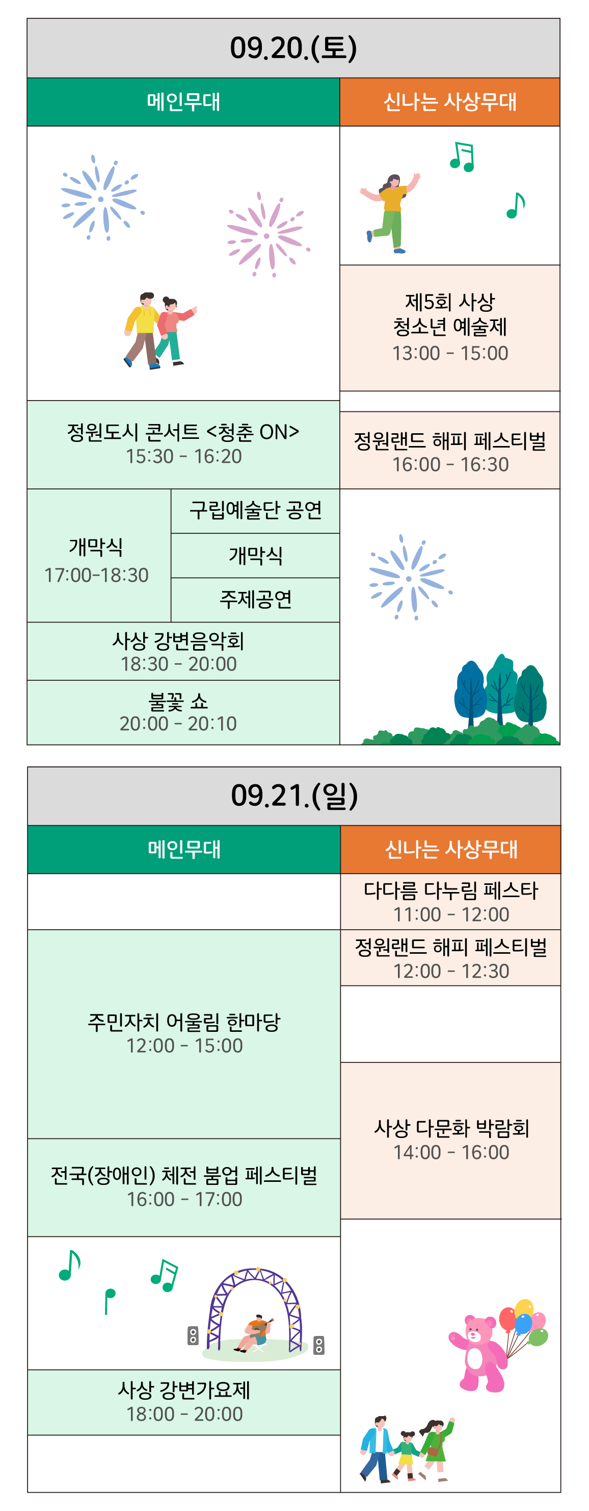 올해로 22회를 맞이한 이번 축제는 ‘정원도시 사상, 도시를 초록하다!’라는 주제로, 다양한 공연과 체험, 먹거리까지 풍성하게 준비되어 있어 남녀노소 누구나 즐길 수 있는 축제로 기대를 모으고 있습니다.