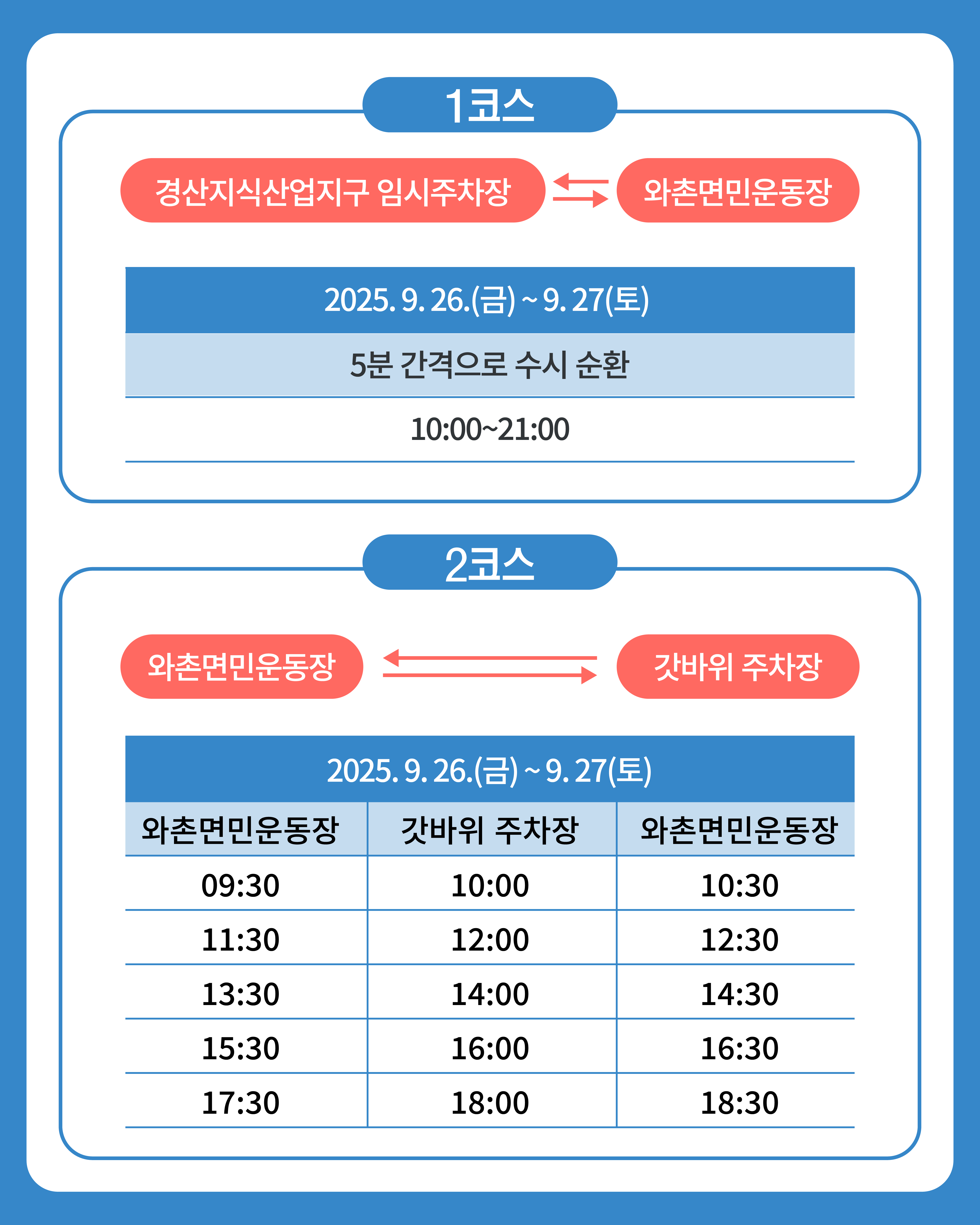 - 1코스: 경산지식산업지구 임시주차장 ↔ 와촌면민운동장 (5분 간격 수시 운행)