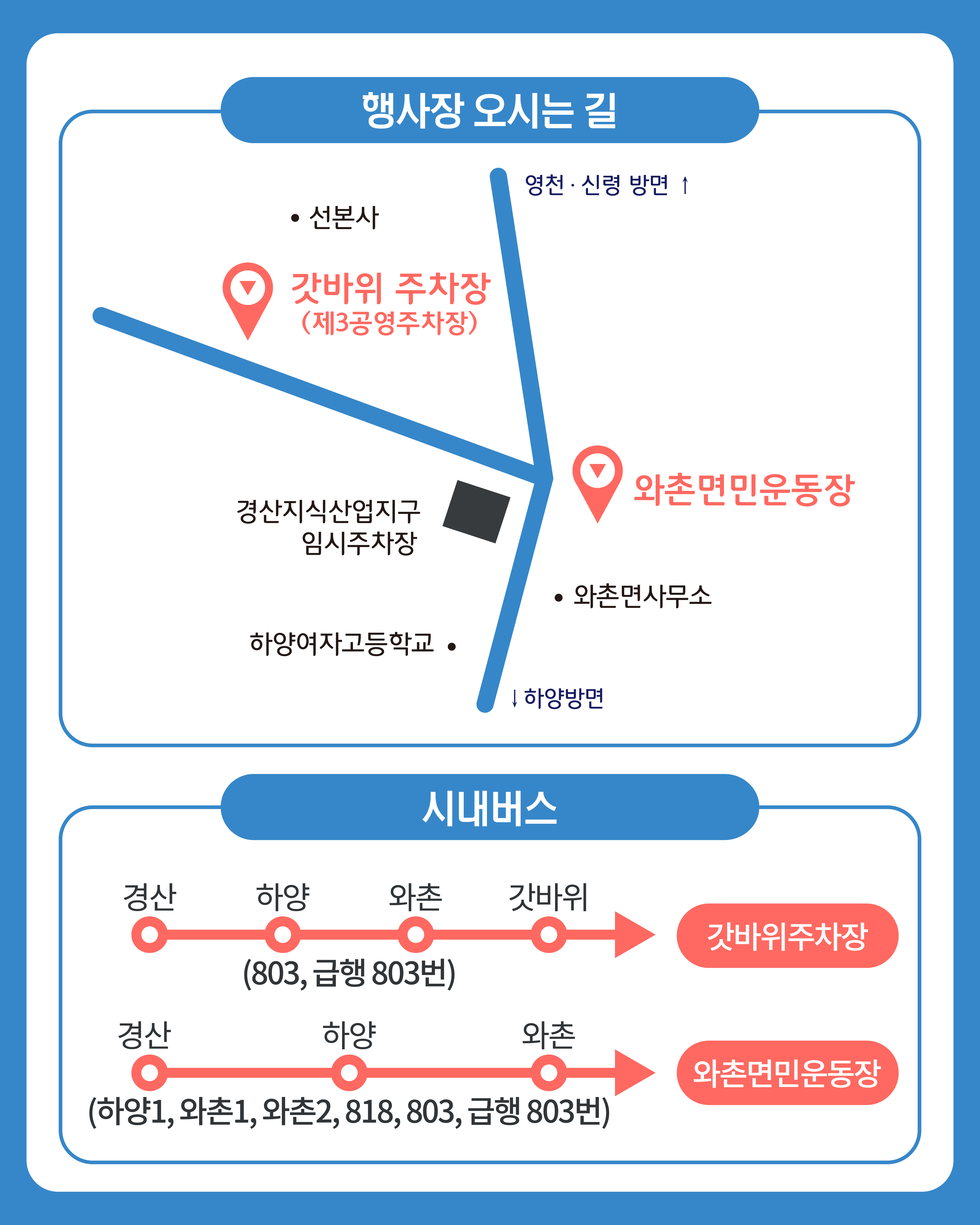 - 장소: 갓바위 주차장, 와촌면민운동장 일원
