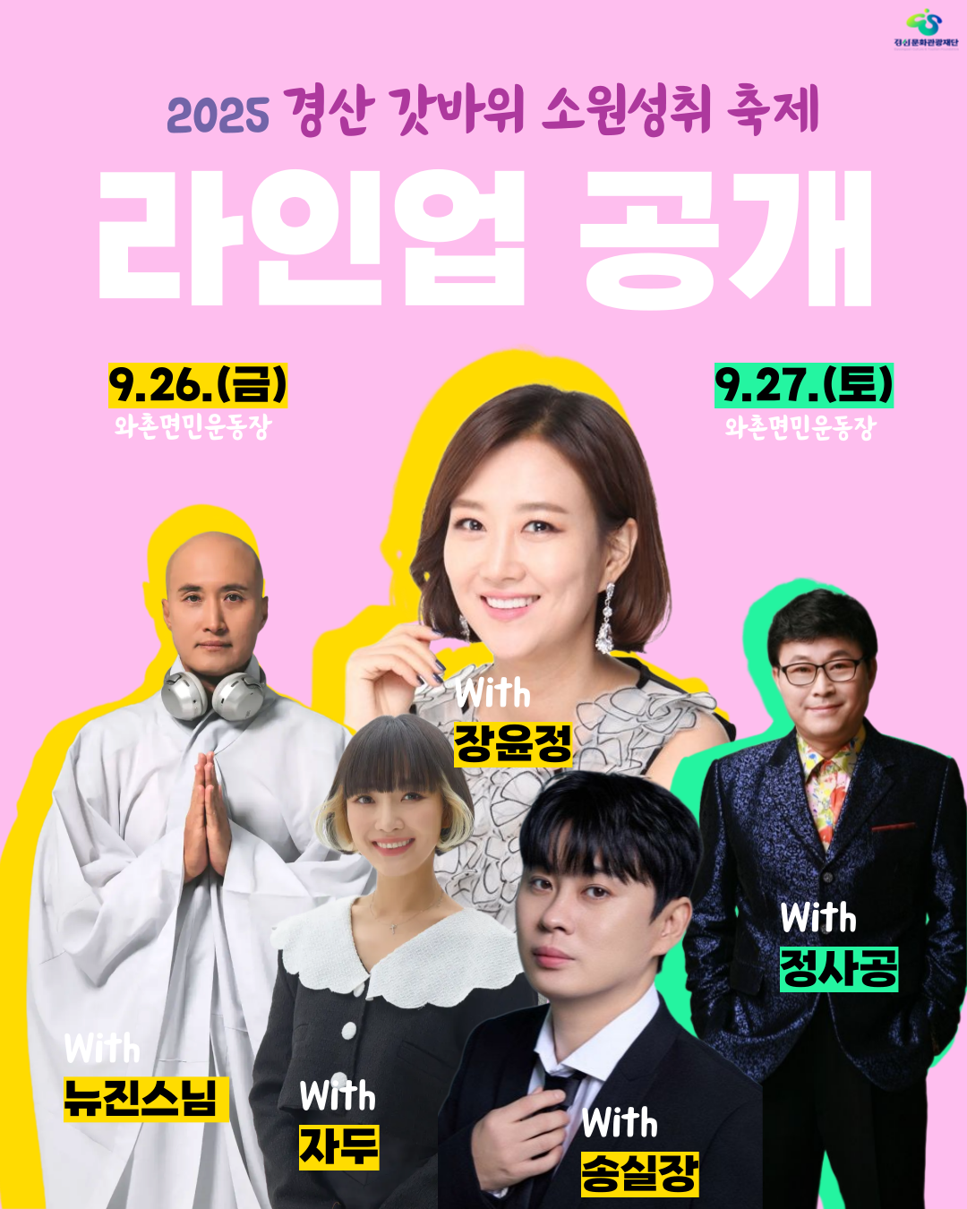2025 경산 갓바위 소원성취축제가 오는 9월 26일(금)부터 9월 28일(일)까지 3일간, 경산 갓바위 주차장과 와촌면민운동장에서 열립니다.