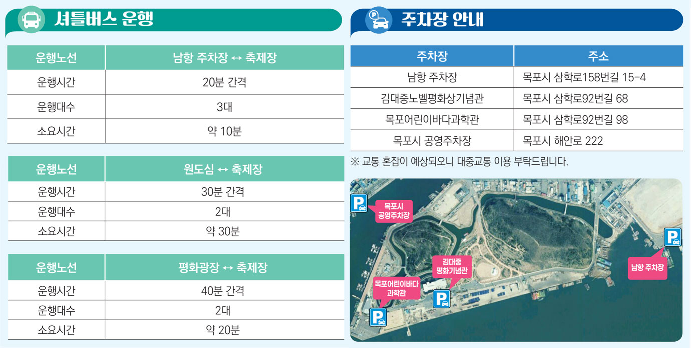 • 남항 주차장 ↔ 축제장 : 20분 간격, 약 10분 소요 (3대 운행)