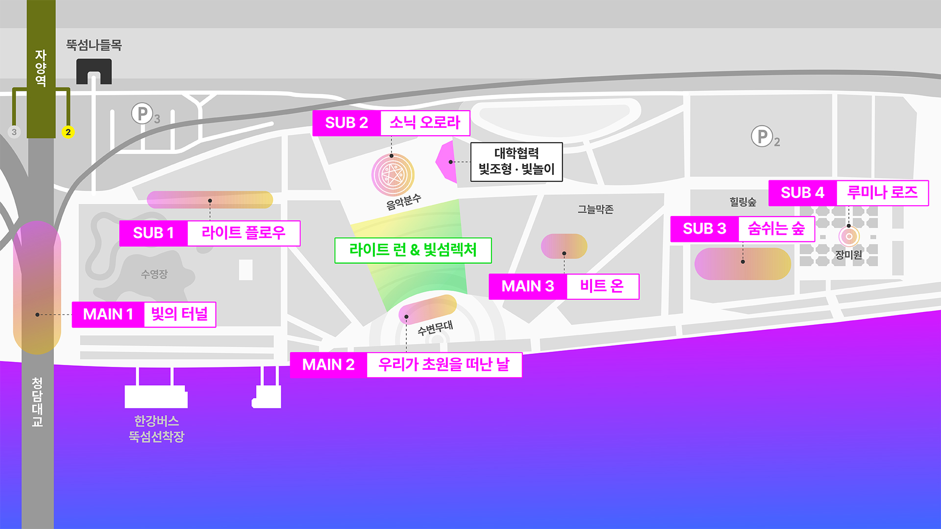 - 특별존 : 라이트 런 & 빛섬렉처 (수변무대 중심 진행)