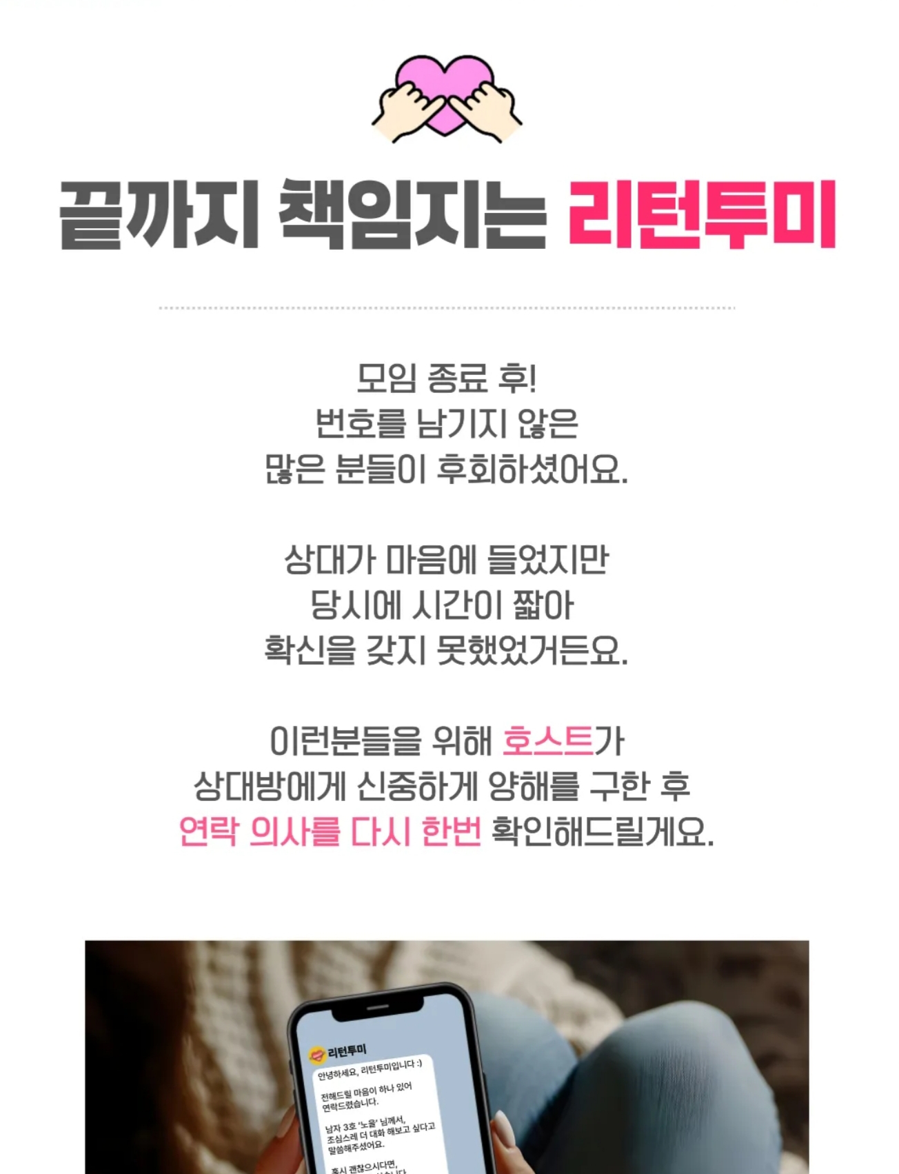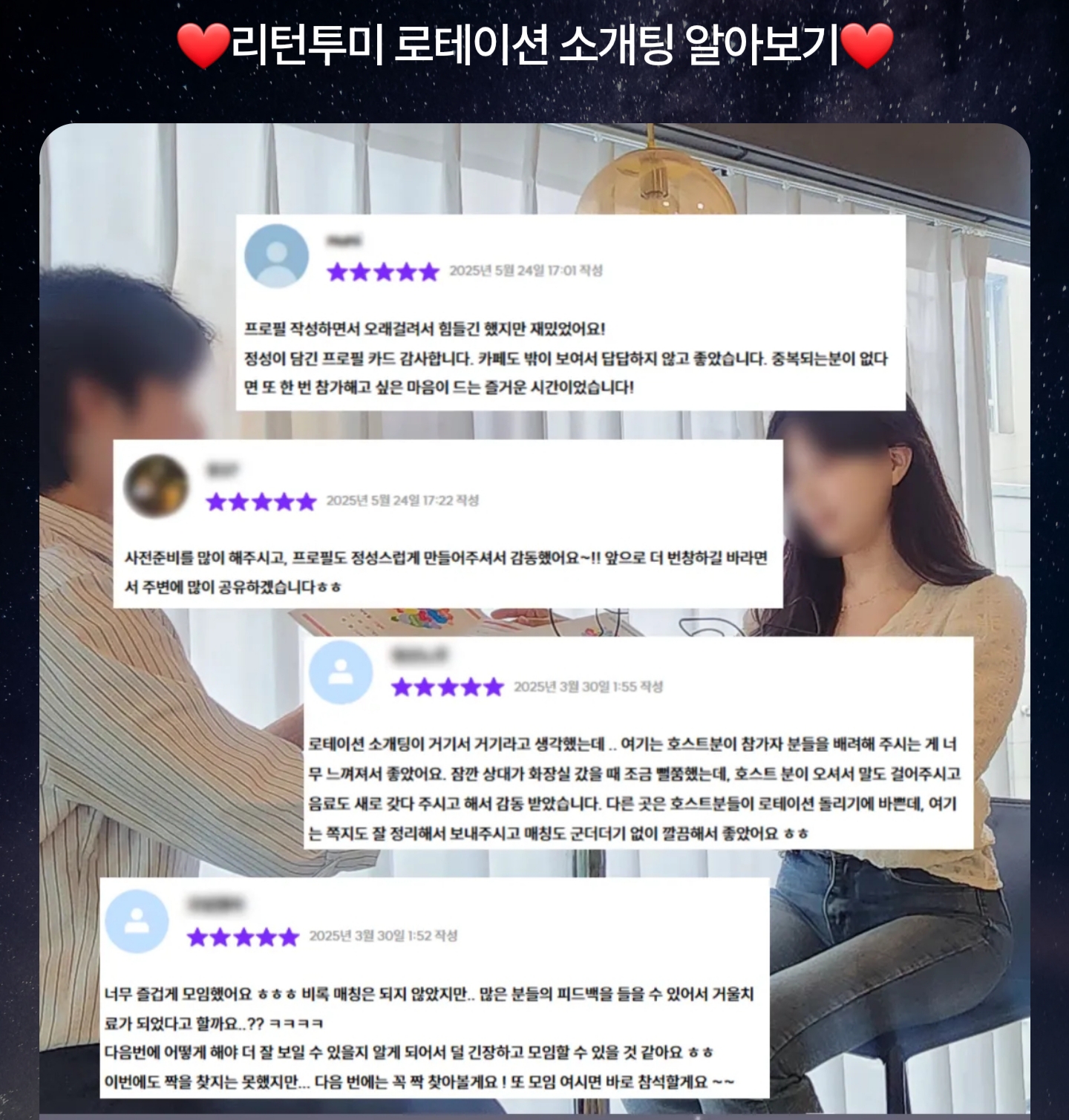 혹시 저처럼 평소 소개팅이 망설여지지만 ‘자연스럽게 인연을 만들고 싶다’는 마음이 있으신 분이라면 리턴투미 로테이션 소개팅을 한 번쯤 경험해보시길 권하고 싶습니다.