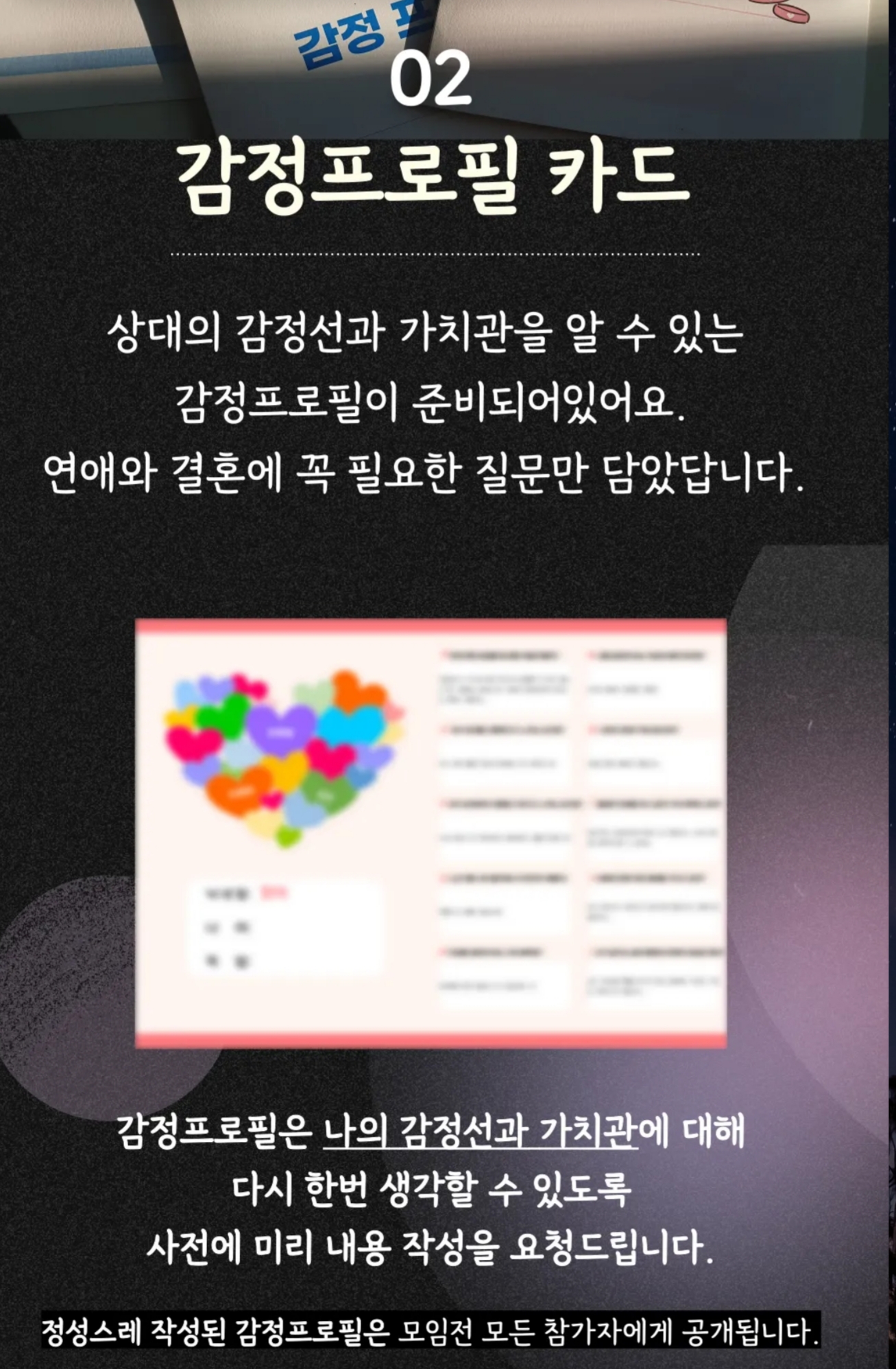 참여자들은 사전에 감정 프로필을 작성하게 되는데, 여기에 좋아하는 취미, 가치관, 연애 스타일 등 여러 항목에 대한 답변을 적습니다.
