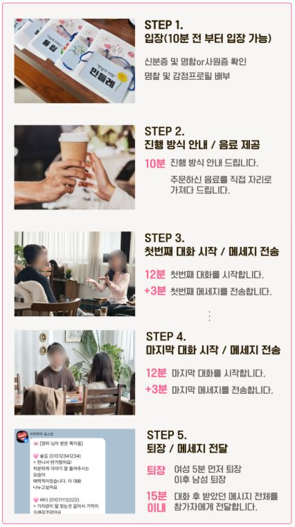 행사는 로테이션 방식으로 진행되는데요! 한 테이블에 앉아 약 8~10분 정도 대화를 나눈 후, 남성분들이 다음 테이블로 자리를 옮기는 구조예요.