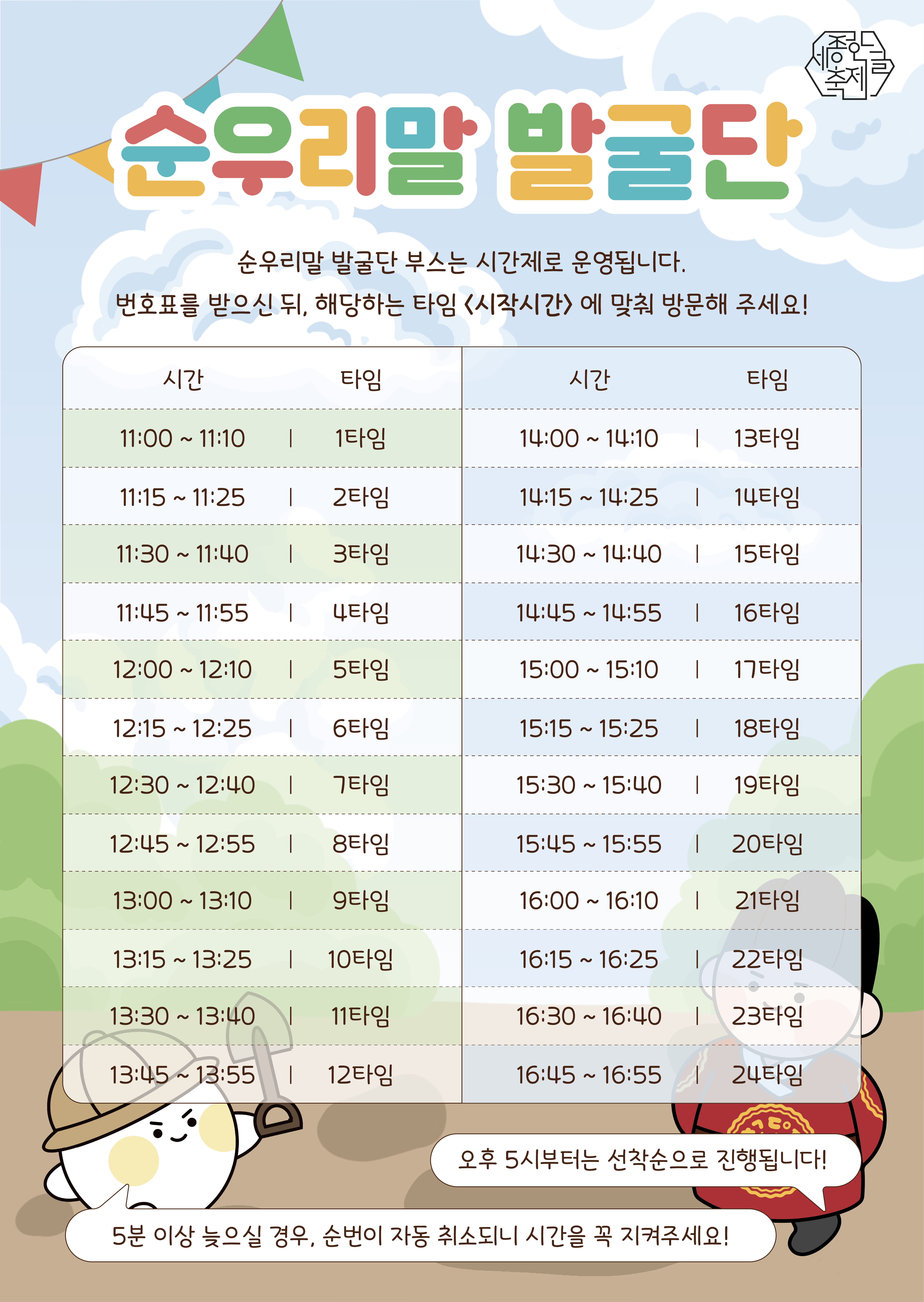- 순우리말 발굴단은 시간제 타임별 입장제이므로 미리 번호표를 받고 방문하세요.