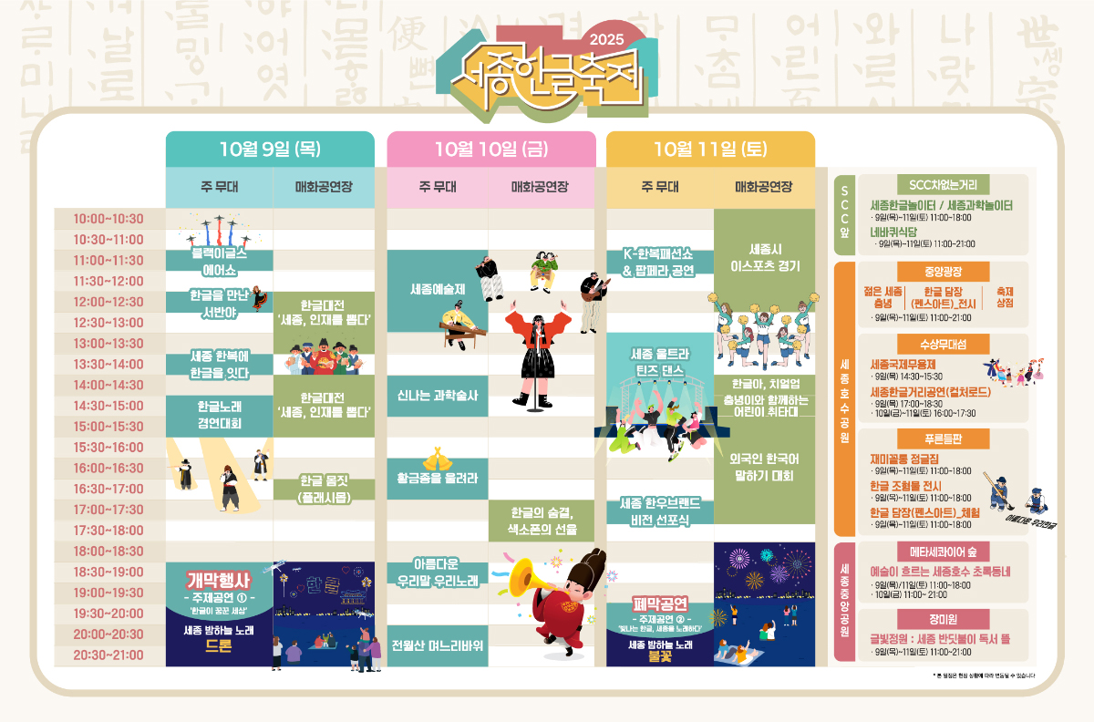 특히 올해는 한글날과 함께 다양한 국제 문화예술 행사가 어우러져 세종을 찾는 이들에게 특별한 시간을 선사합니다.