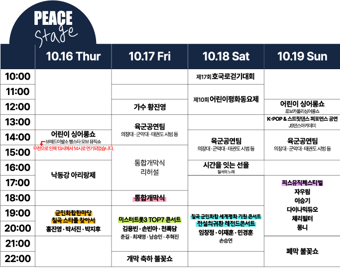 이번 축제의 하이라이트, PEACE STAGE(평화의무대) 4일 내내 쉴 틈 없이 이어지는 초호화 무대들이 관람객을 맞이합니다.