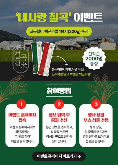 축제 기간 중 선착순 2,000명에게 칠곡할미 백진주쌀(300g) 을 증정합니다