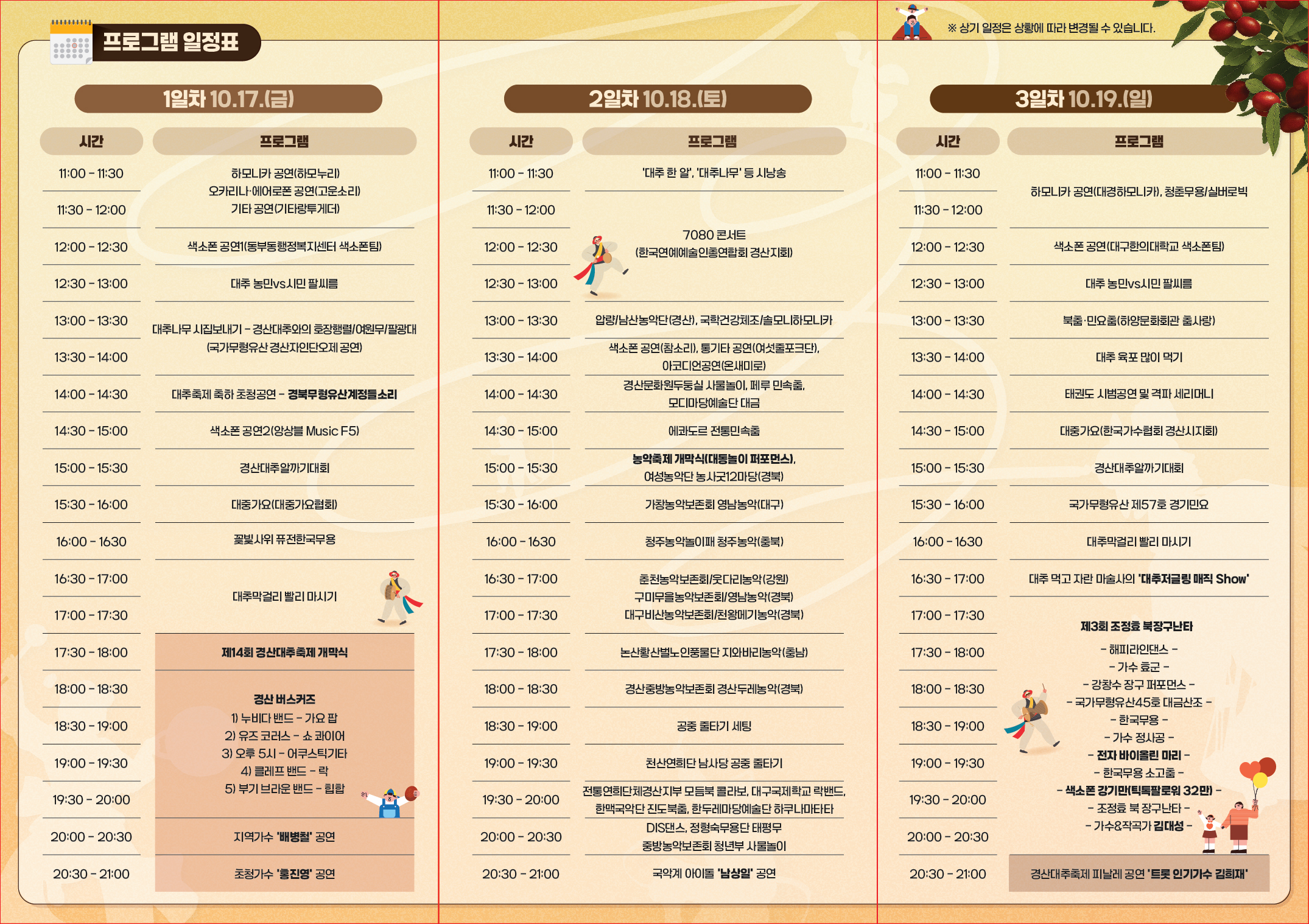 - 대추농가 판매존, 체험부스, 플리마켓, 버스킹존 상시 운영