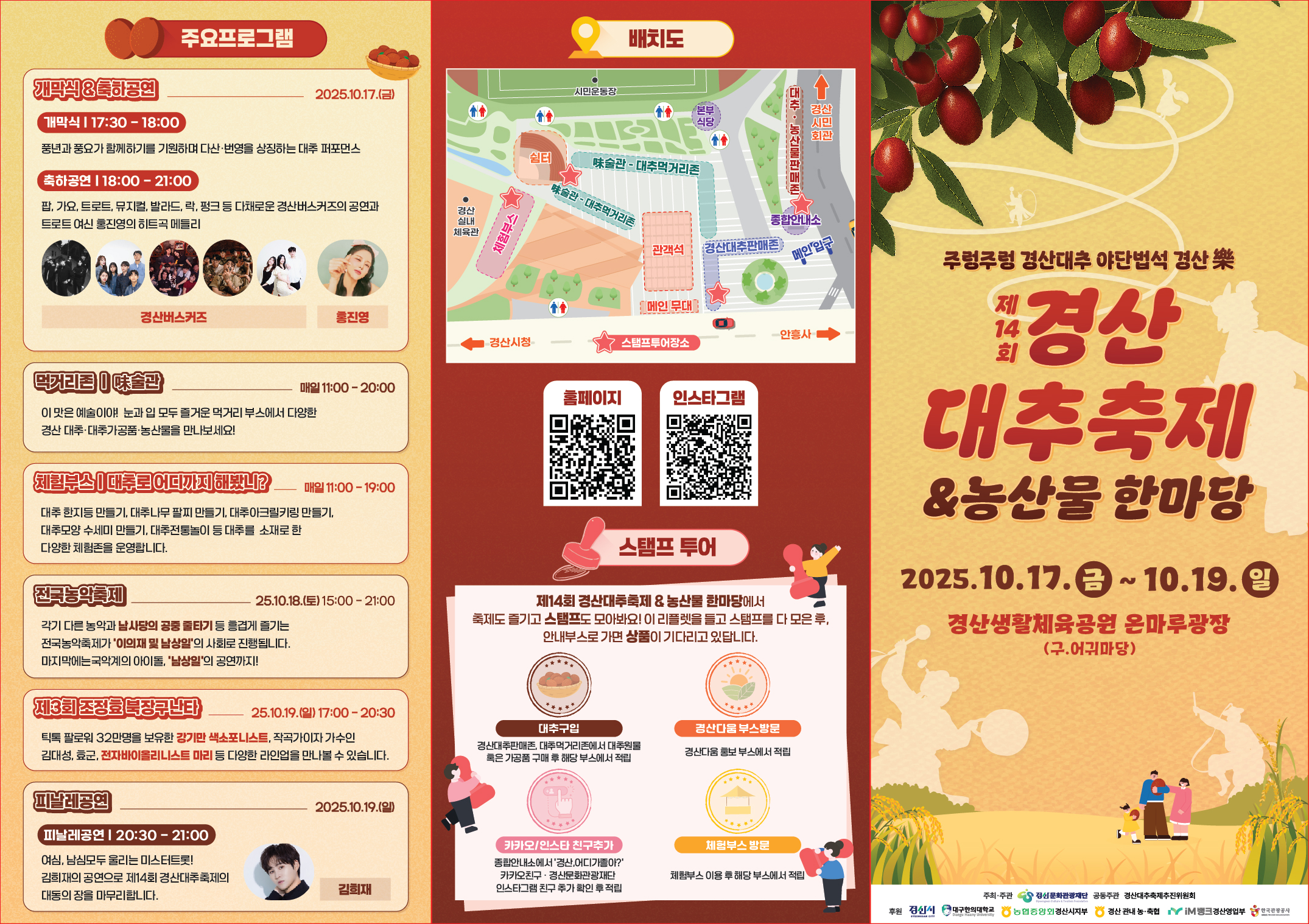**‘제14회 경산대추축제 & 농산물 한마당’**이 올해도 다양한 먹거리, 즐길거리, 공연으로 가득한 가을 대표 축제로 돌아왔어요.