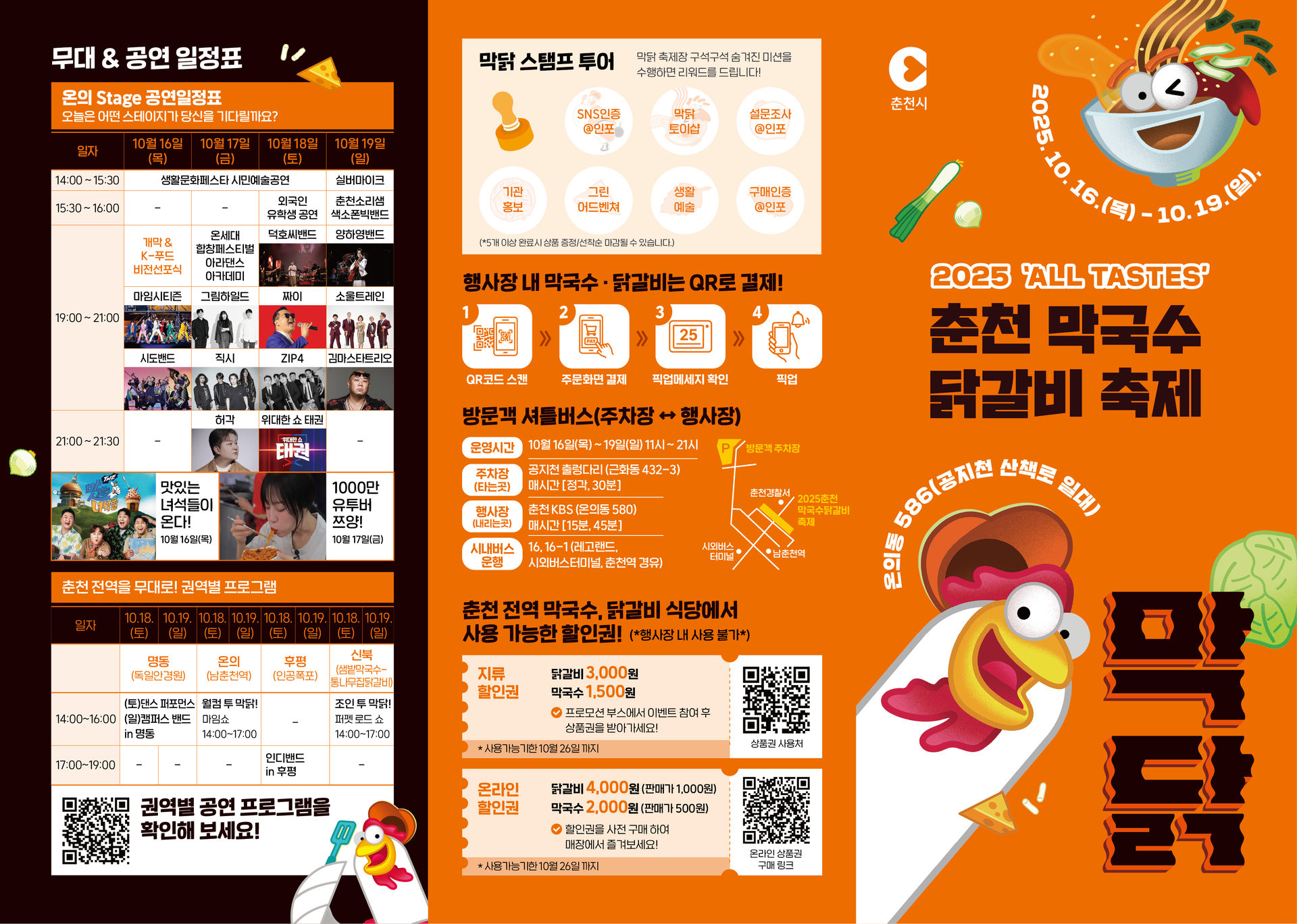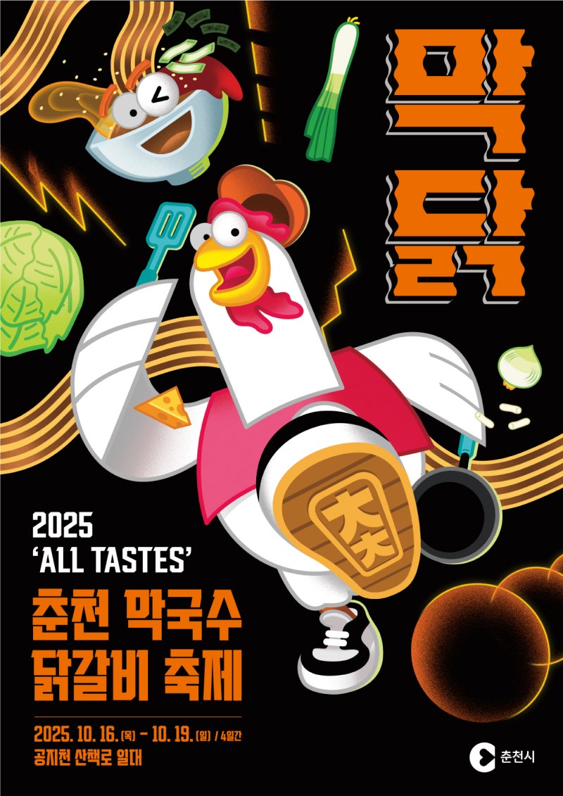 춘천의 대표 음식인 막국수와 닭갈비를 중심으로 열리는 ‘2025 춘천막국수닭갈비축제’가 **10월 16일(목)부터 19일(일)**까지 공지천 하천 일대에서 개최됩니다.