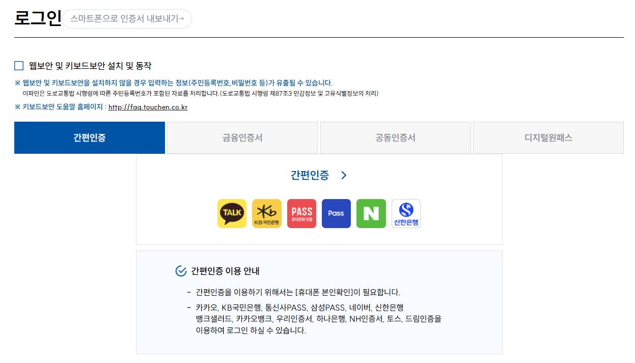 - 간편인증 / 공동인증서 / 금융인증서 중 하나로 로그인