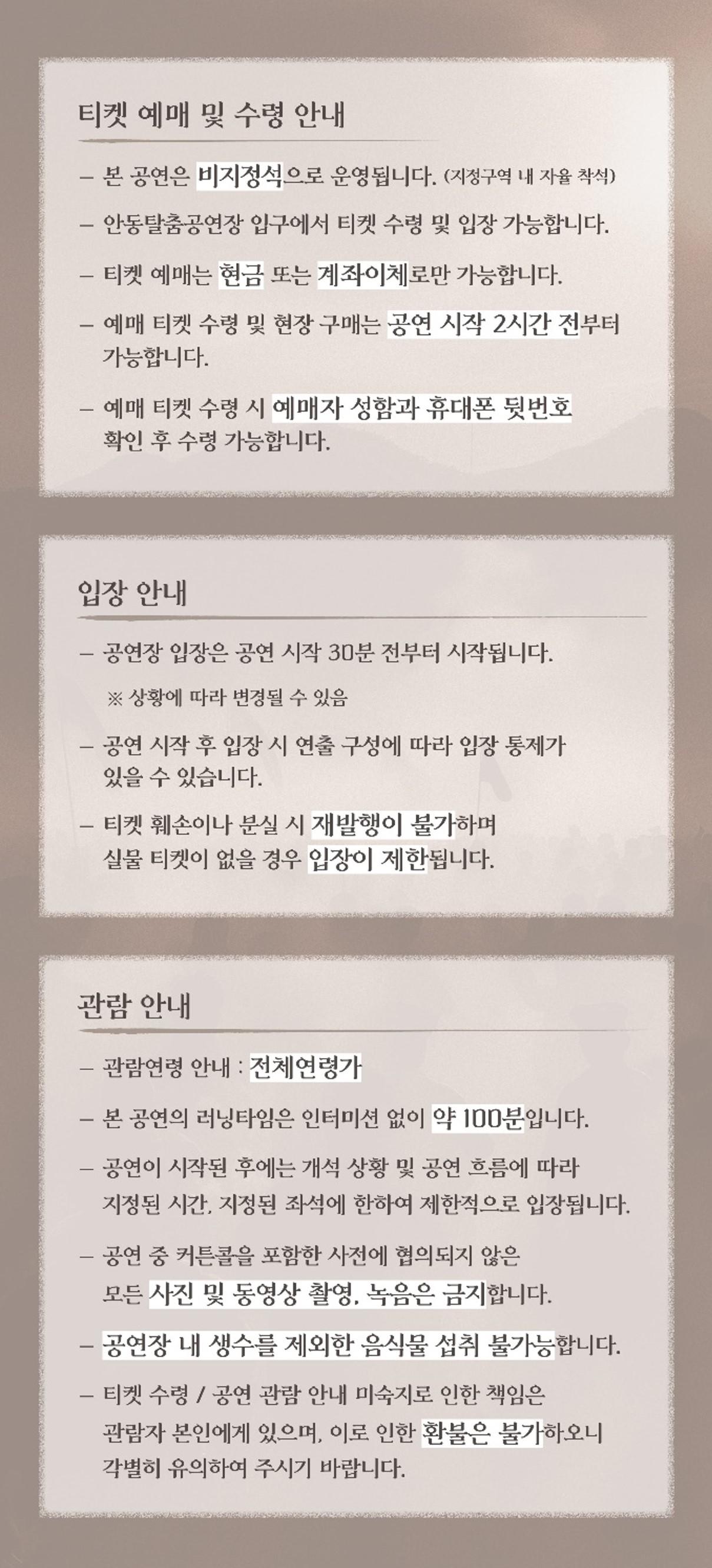 - 현장 예매: 공연 시작 2시간 전부터 가능 (잔여석 한정)