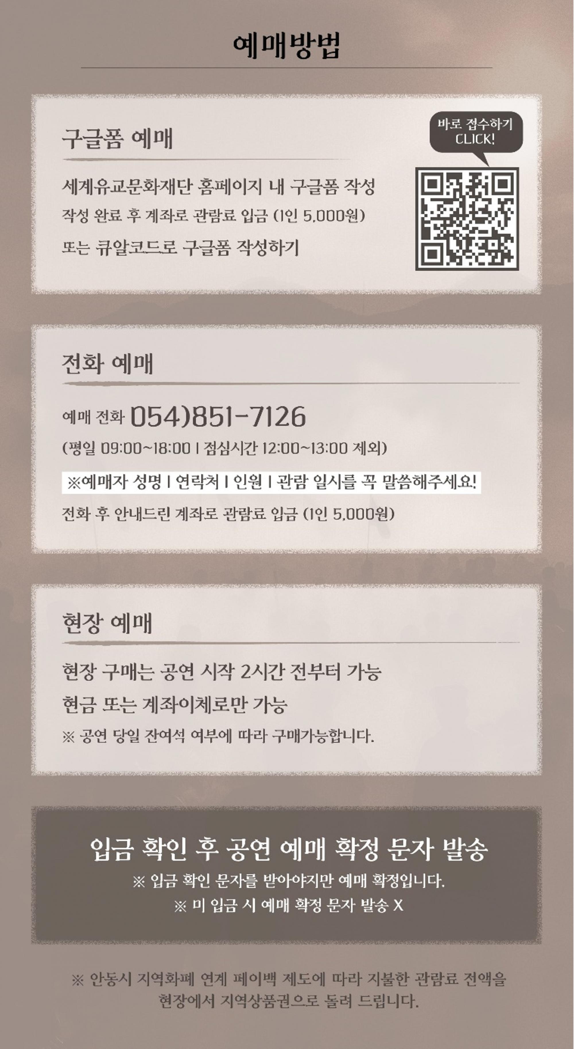 - 전화 예매: 054-851-7126 (평일 09:0013:00 제외)