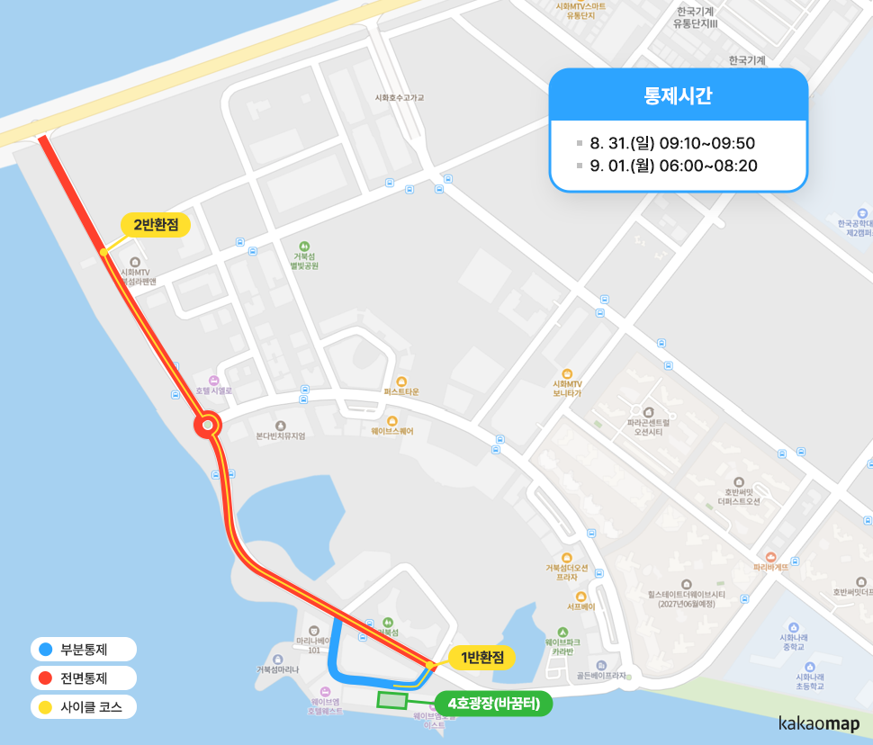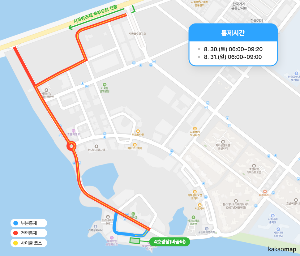 시화방조제 하부도로 진입 제한, 거북섬 주요도로 전면·부분 통제, 자전거도로 통제, 차 없는 거리 운영 등이 포함됩니다.