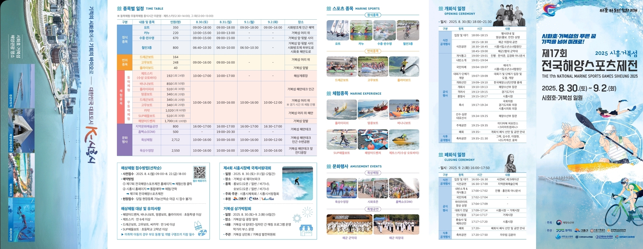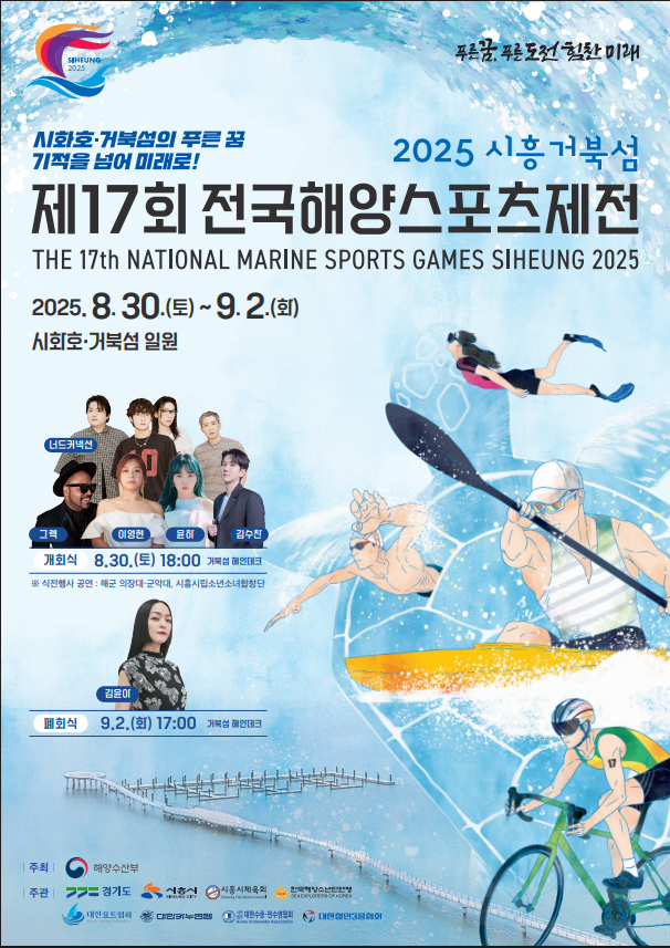 오는 2025년 8월 30일(토)부터 9월 2일(화)까지, 경기도 시흥 거북섬과 시화호 일원에서 「제17회 전국해양스포츠제전」이 개최됩니다.