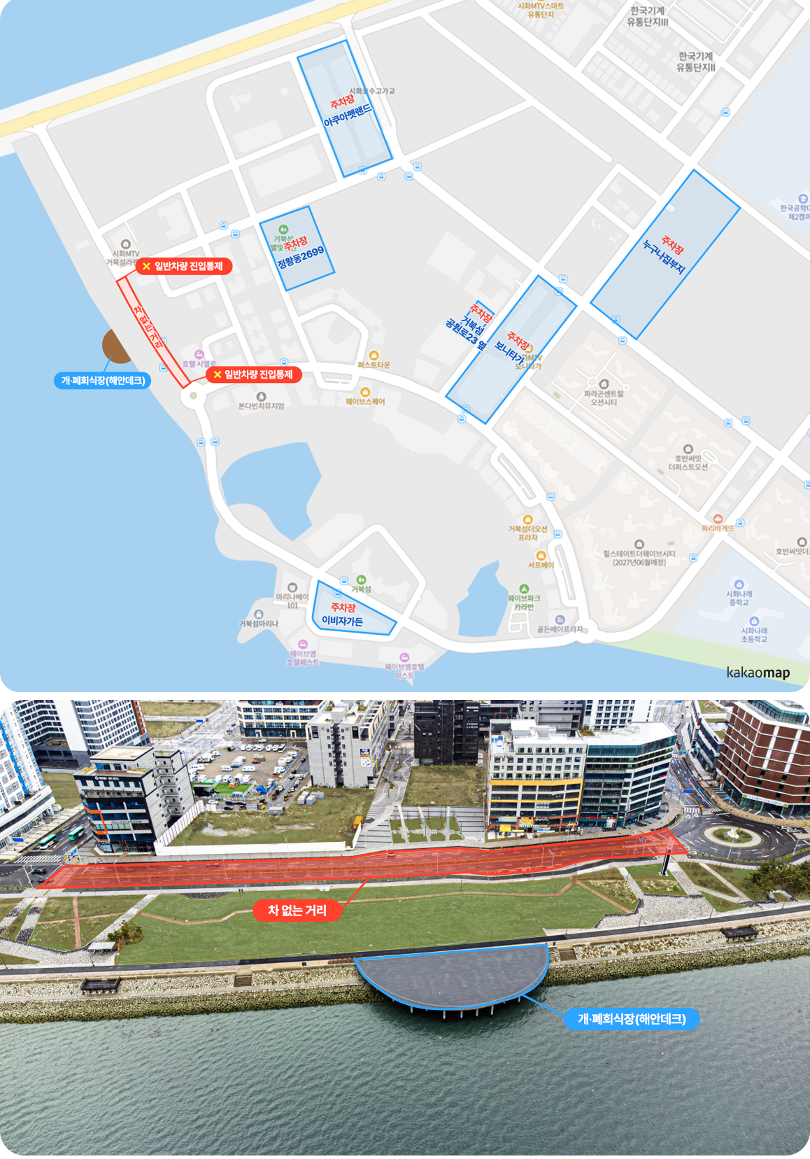 - 임시주차장(6개소) : 아쿠아펫랜드, 보니타가, 이비자가든, 정왕동 2699, 정왕동 2690(대형버스), 거북섬공원 인근
