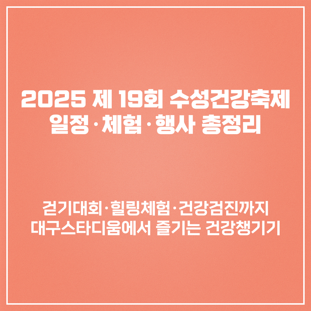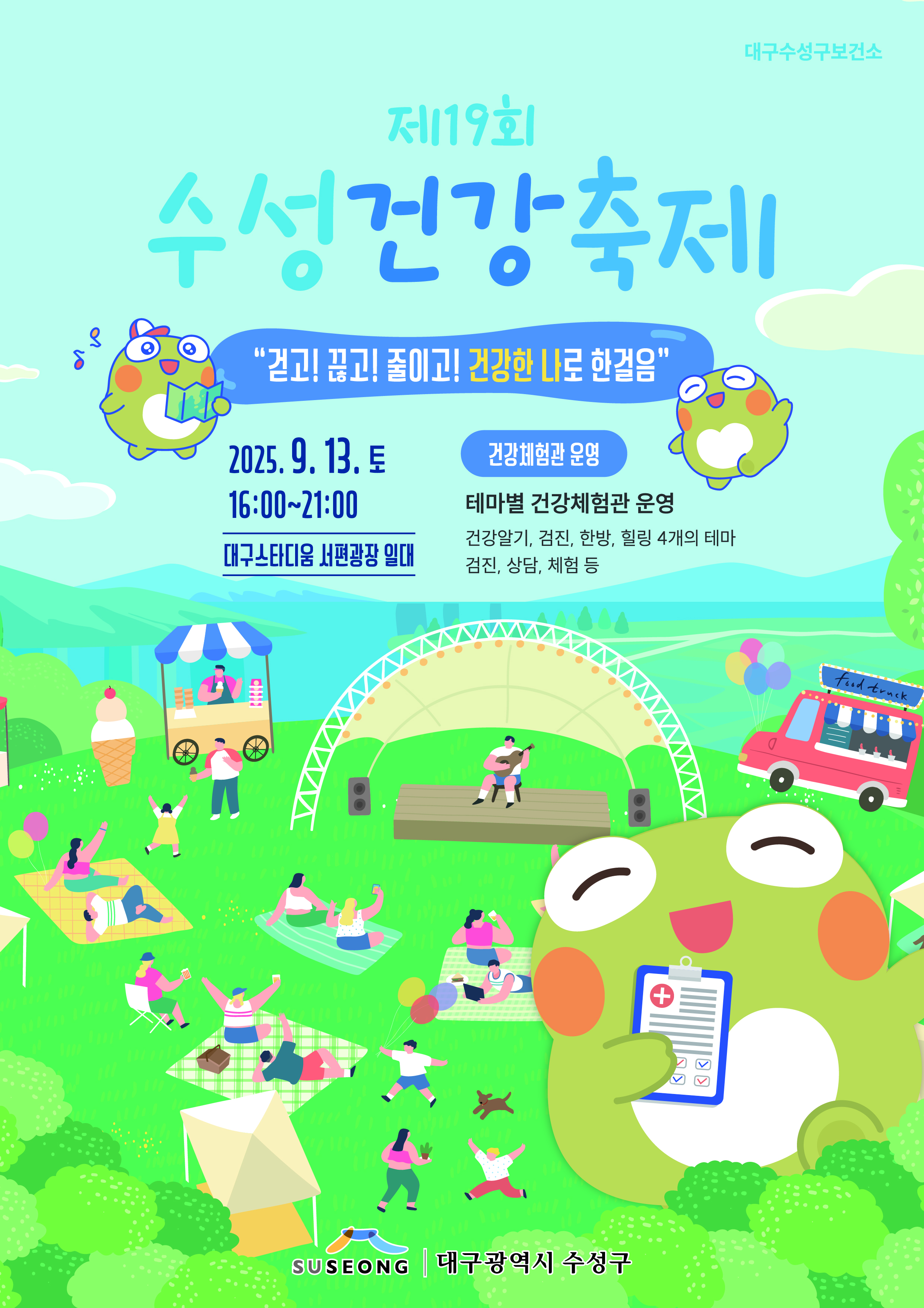 대구 수성구보건소는 지역 주민들에게 건강 정보와 체험 기회를 제공하고자 오는 2025년 9월 13일(토) 오후 4시부터 9시까지, 대구스타디움 서편광장에서 제19회 수성건강축제를 개최합니다.