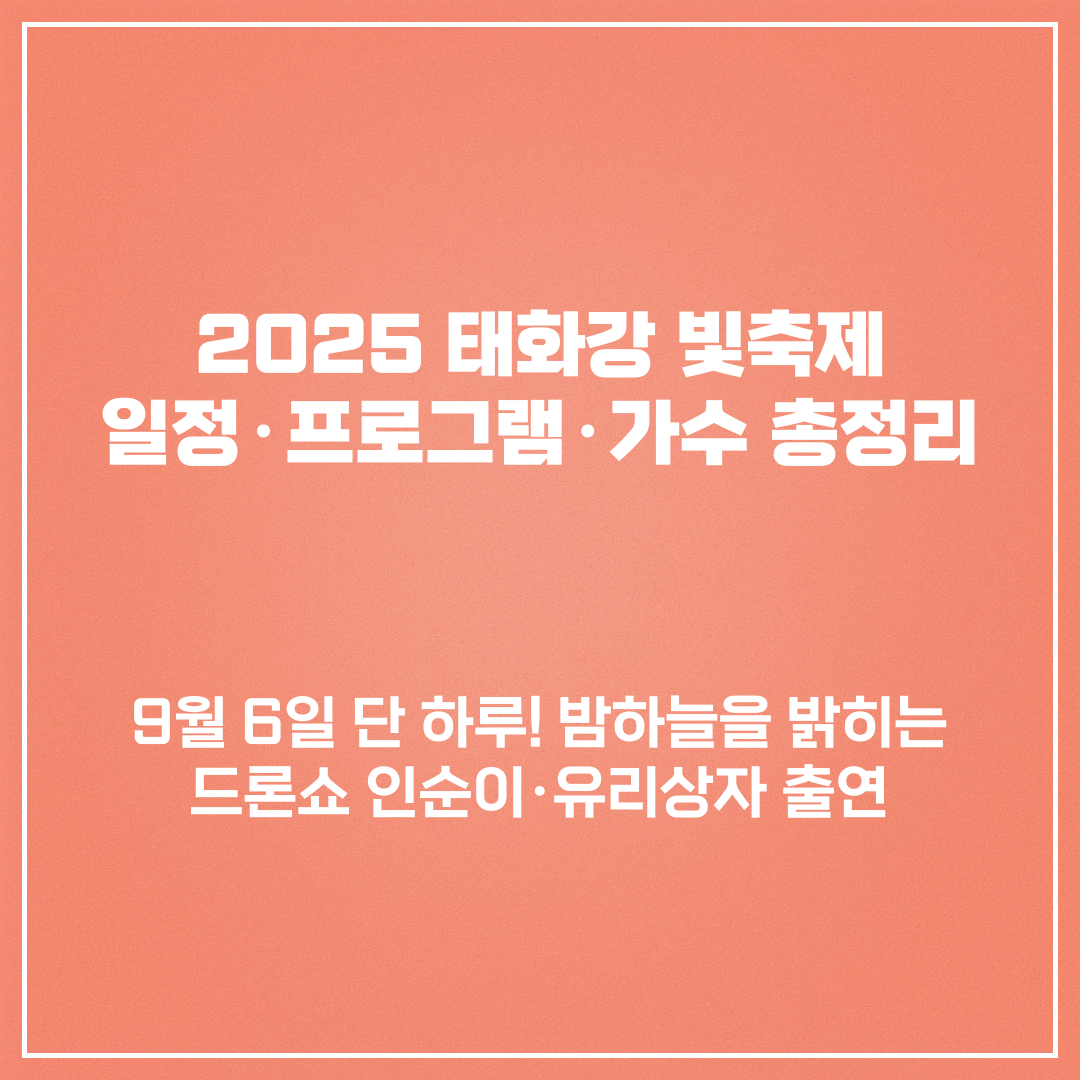 울산 밤하늘 수놓는 1,000대 드론쇼 2025 태화강 빛 축제가을밤, 울산을 대표하는 야간 문화관광 축제가 다시 찾아옵니다.2025 태화강 빛 축제(드론 뮤직 페스티벌)은 드론과 음악, 다양한 체험 콘텐츠가 어우러지는 복합형 행사로, 울산의 도시 브랜드 이미지를 한층 높여주는 대표 축제입니다.📅 행사 개요행사명: 2025 태화강 빛 축제 – 드론 뮤직 페스티벌일시: 2025년 9월 6일(토) 13:00 ~ 22:00장소: 울산 남구 태화강 둔치 일원주최/주관: 경상일보후원: 울산광역시, 울산광역시 남구🎶 주요 프로그램태화강 빛 축제는 세대와 세대를 아우르며 누구나 즐길 수 있는 야간 콘텐츠로 구성되어 있습니다.올해는 특히 인순이, 유리상자 등 인기 아티스트가 개막 공연 무대에 오르며, 음악과 드론이..