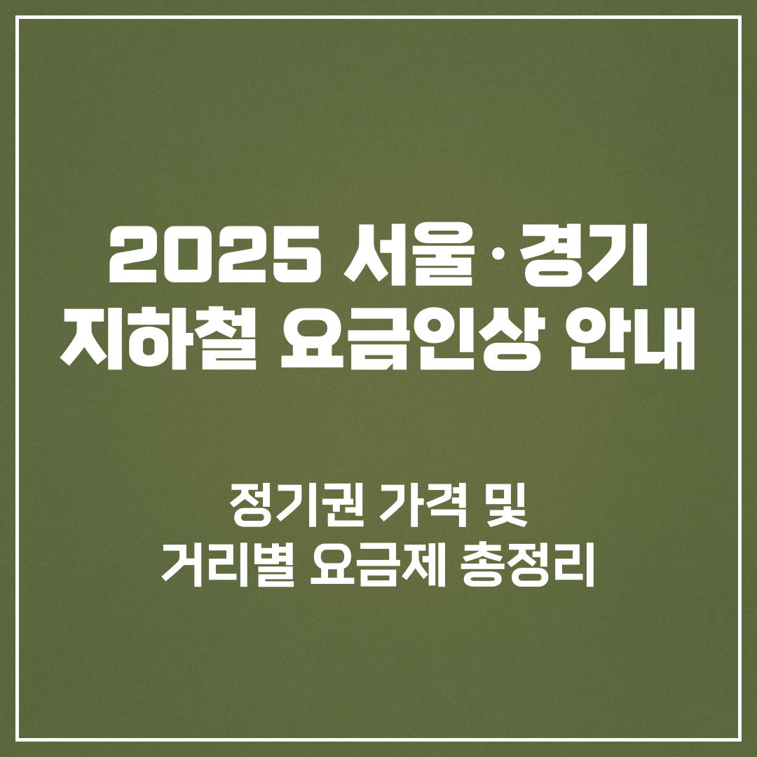 2025 수도권 지하철 정기권 총정리 💳요금 인상에도 현명하게 아끼는 법!2025년 6월부터 수도권 지하철 기본요금이 인상됨에 따라 교통비 절약을 위한 정기권 이용자들이 늘고 있습니다. 특히 출퇴근, 통학 등으로 지하철을 자주 이용하는 경우 정기권을 통해 교통비를 효과적으로 줄일 수 있는데요.이번 글에서는 정기권 종류, 가격, 사용범위, 거리비례 요금표까지 모두 정리해드립니다.✅ 정기권이란?일정 기간 동안 일정 횟수(최대 60회)까지 이용 가능한 교통카드30일간 60회까지 사용 가능하며, 초과 시 사용 불가최초 구매 시 카드값 2,500원 추가 부담🔹 정기권 종류1. 서울전용 정기권가격: 61,600원이용 가능 구간: 서울 지하철 전 노선 (1~9호선, 경의중앙선, 분당선, 신분당선 등)이용 불가: ..
